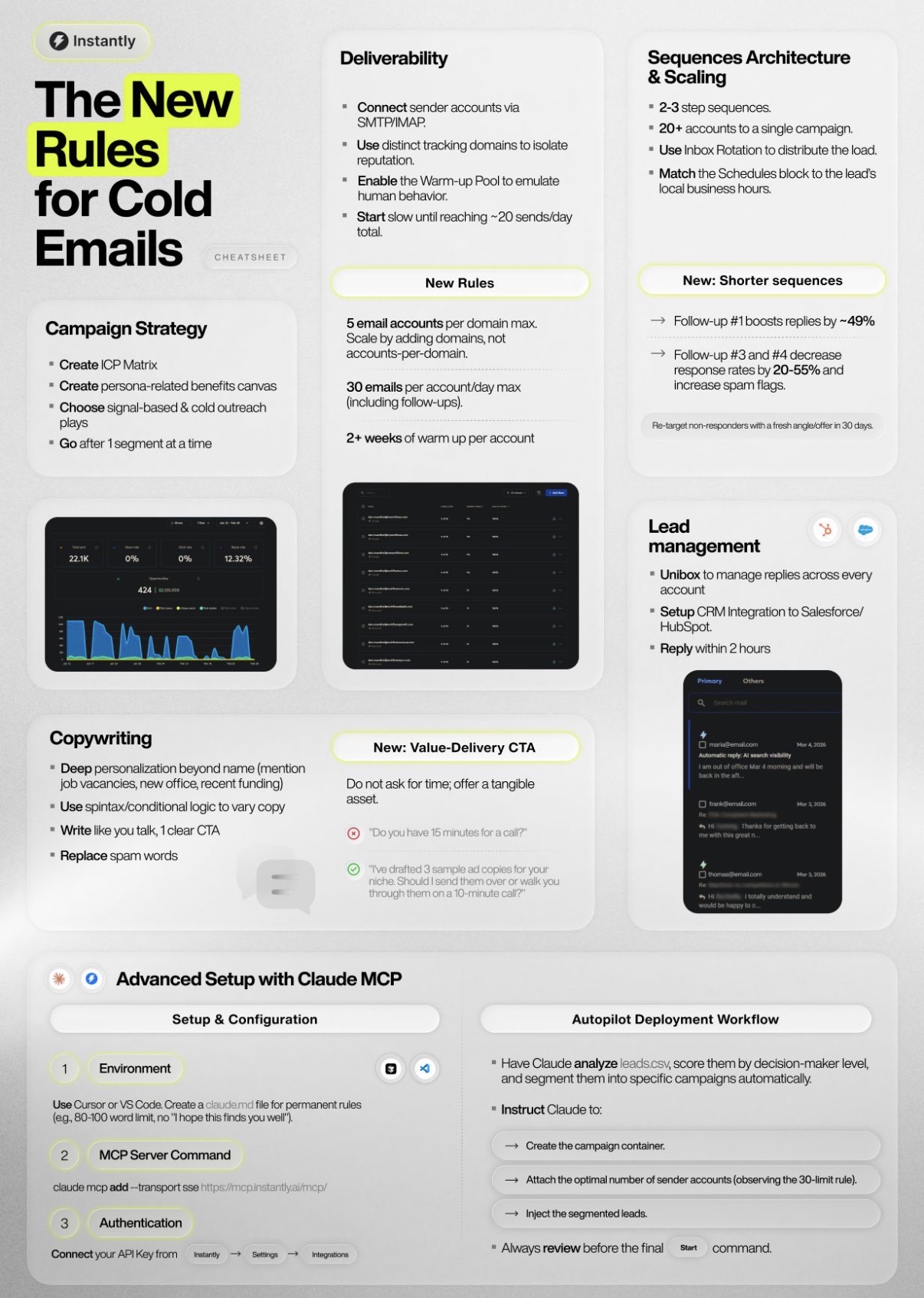 Important Details: Key rules for domain health include a maximum of 5 email accounts per domain and 30 emails per account daily, with a 2-week minimum warm-up period. High-performing sequences are limited to 2-3 steps, as follow-up #1 boosts replies by 49%, while follow-ups #3-4 significantly decrease response rates and increase spam risks. Effective copywriting requires personalized messaging, spintax logic, and value-delivery CTAs that offer tangible assets rather than time-based meeting requests.